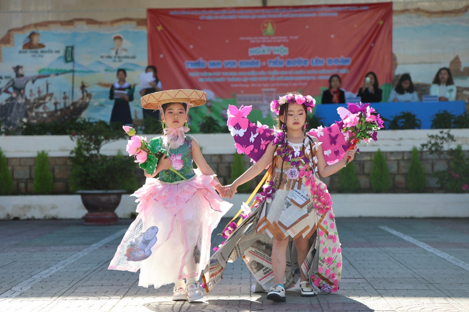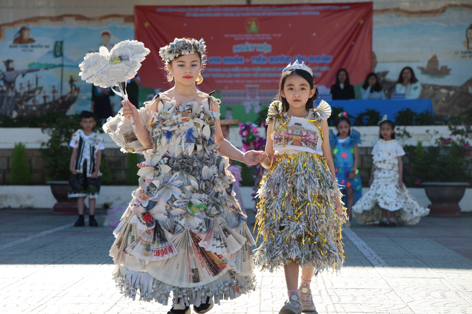 Những bộ trang phục được thiết kế từ các vật liệu tái chế như giấy, nhựa, bao bì… do chính các em học sinh sáng tạo và trình diễn đã truyền tải thông điệp ý nghĩa về bảo vệ môi trường, góp phần nâng cao ý thức tiết kiệm, tái sử dụng và giữ gìn môi trường xanh - sạch - đẹp trong trường học.